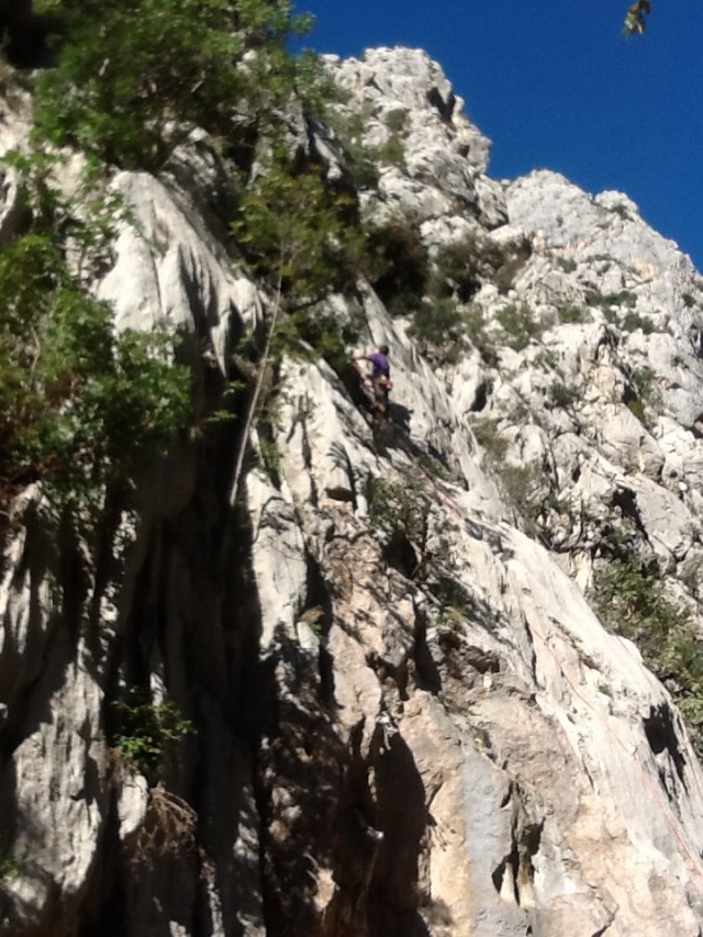 Woke up to sunshine today and after a two second discussion we decided we were staying to hike Paklenica National Park and head out later in the day to Plitvice NP and hike there tomorrow………so glad we did as it was amazingly beautiful. Went for five hours and hardly saw a soul but all kinds of beauty surrounded us. In a nutshell Paklenica, and I often spell it wrong, is a 95 square kilometre park that is a rock climber’s dream. However it is so much more than that. It has an amazing diversity of flora and fauna and unbelievable landscapes. Due to its limestone and dolomite structure Paklenica is distinguished by the richness of kartstic phenomena such as karrens, karst ponds, pillars, natural bridges, pits and caves…….none of this I really get but I put it here from the guide for my brother in law Michael who is a geologist and should definitely come to Croatia!!!! In a nutshell we had a fabulous five hour hike, return, through Velika Paklenica Canyon and reached the Lugarnica forest cottage at an altitude of around 400 meters above sea level. Here they provide simple catering services and since we were the only ones there, and because it was so rustic and the three guys looked bored, I asked for a cappuccino! The response was “how’s a Turkish coffee?”….and I said “great”…….and so it was. See the picture of their site and “where’s Paklo?”