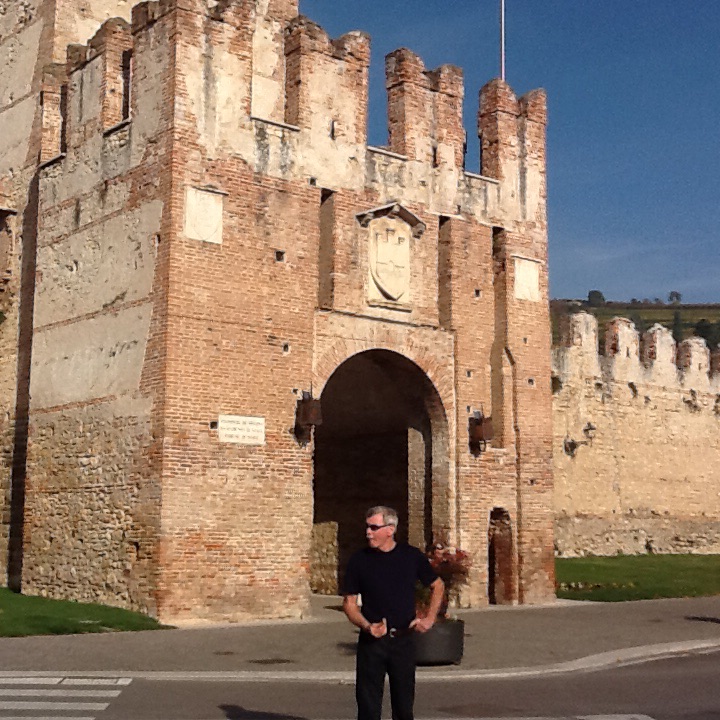 Venice was great but we were glad to leave the crowds so took the early morning train back to Maestre to pick up our car and head somewhere although we weren’t exactly sure where. In Venice we met a couple of young women who were living in the Netherlands but one was originally from Venice so she mentioned a couple of places that were worth visiting. The first was a place called Soave and both Jim and Marilyn quickly tuned into the wine, Soave I guess, that was a very well known white wine. So we headed there and the first two pictures above of Jim were taken there. It was a very picturesque little place and is well known for the valpolicella grape which is used in one of my favorite wines, Amarone. As mentioned earlier it is also known for its famous white wine, Soave, but given that it was around noon when we arrived we decided against having wine and had a gelato instead………equally delicious! From Soave we headed towards Bardolino, a small town on Lake Garda that was also recommended and that’s where the other three pictures were taken. When we arrived it was 22 degrees and I am sure that every Italian for miles around was there as the place was exploding with people. There was no place to park the car and it was difficult to walk the streets of this beautiful little seaside resort known for its light fruity wine, which I don’t like. However we had a long walk on the beach boardwalk and by suppertime it had emptied a little and we had a great meal of pasta and salad with a little wine that wasn’t fruity as none of us liked that variety. Headed to bed early and by 7am we were walking on the beach and there wasn’t a soul in sight…….amazing! That’s when I took the pictures above……….a beautiful seaside resort when it’s not crowded – guess we have lived in Tidnish too long.