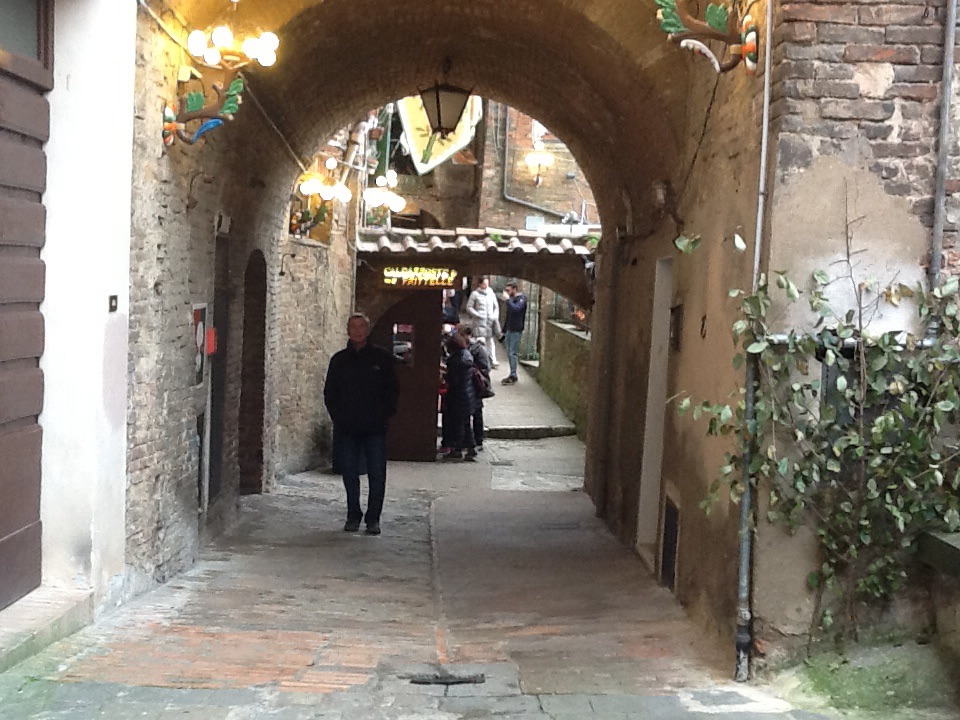 Piazza del Campo is one of the most famous squares in the world and you only have to walk around it to understand why! At the top of the square is the Fonte Gaia(fountain of joy) named for the general joy that accompanied its inauguration in 1348. Every year on July 2 and Aug. 16 there is the famous Palio horse race here where Sienna’s 17 neighborhoods are represented. Apparently the city erupts with competition and fun where ten of the neighborhoods are represented during days of trial races – google Siena’s Palio for the full story and pictures to match! Enjoyed a cappucino here watching tourists watching other tourists and of course children feeding the pigeons. Speaking of pigeons, Jim alerted us that he read if one craps on your head you should let it harden because if you try and wipe it off then it’s all over your hair. Fortunately, and luckily, none of us have had that experience yet although there have been a few close calls!