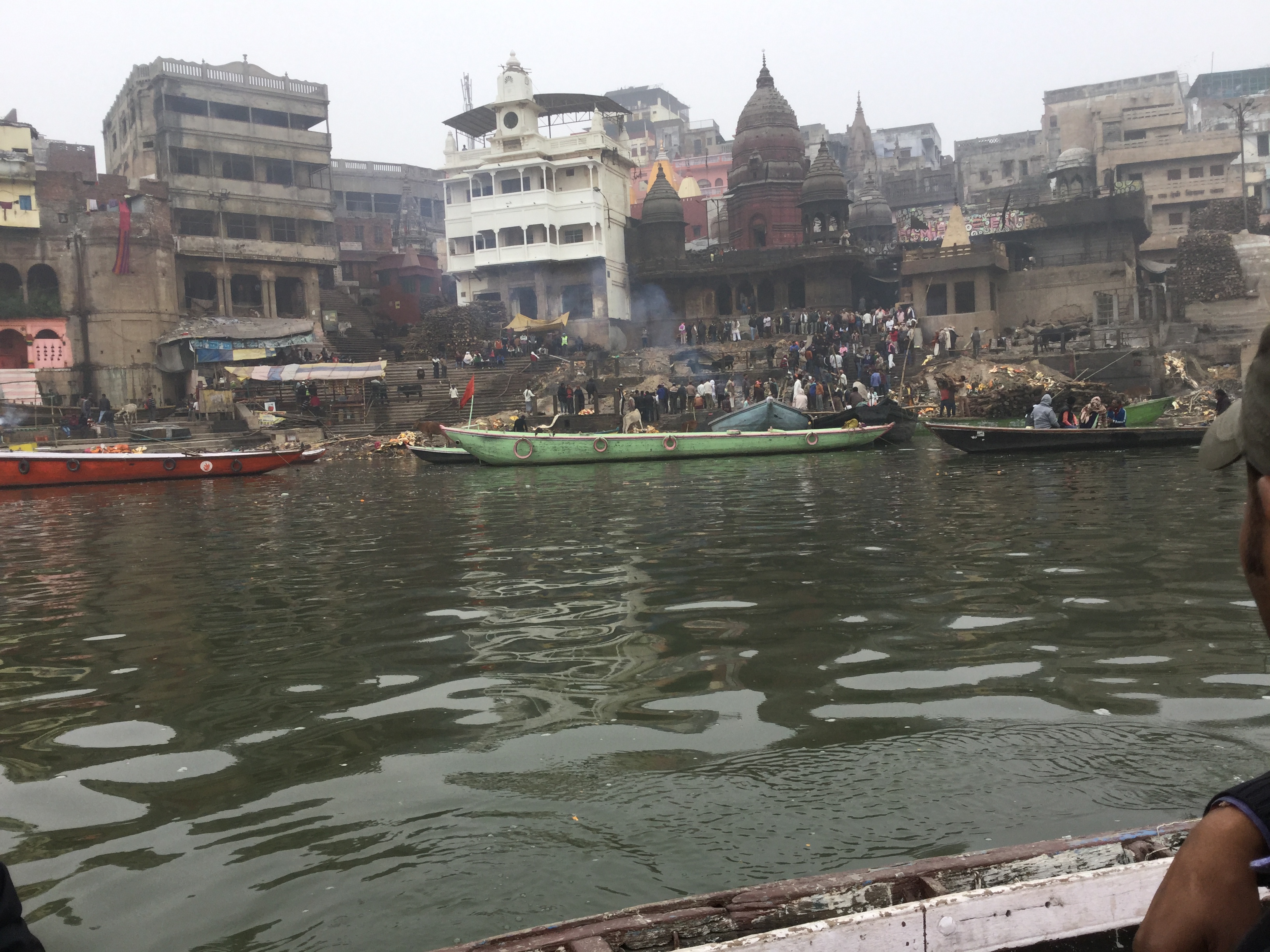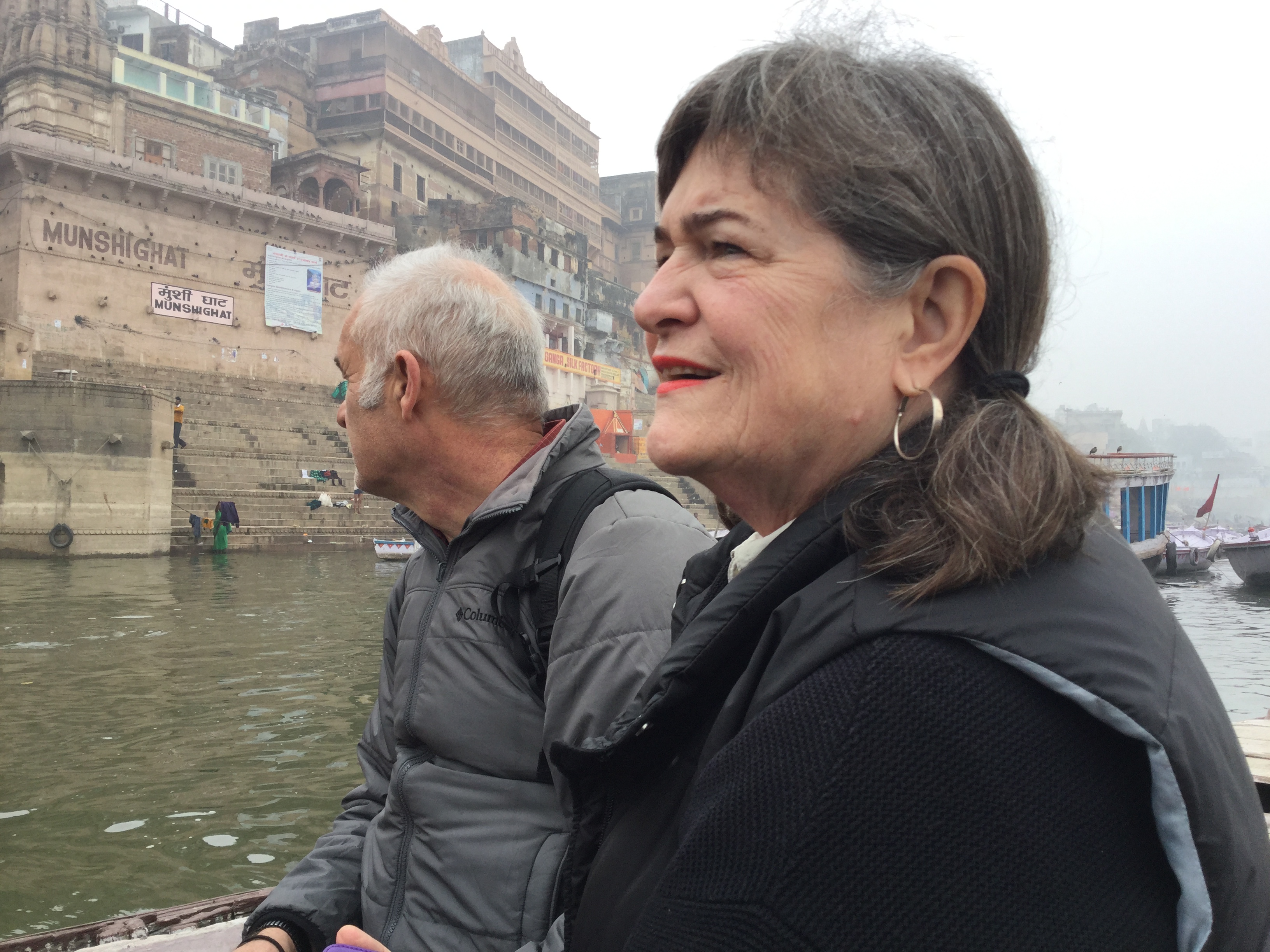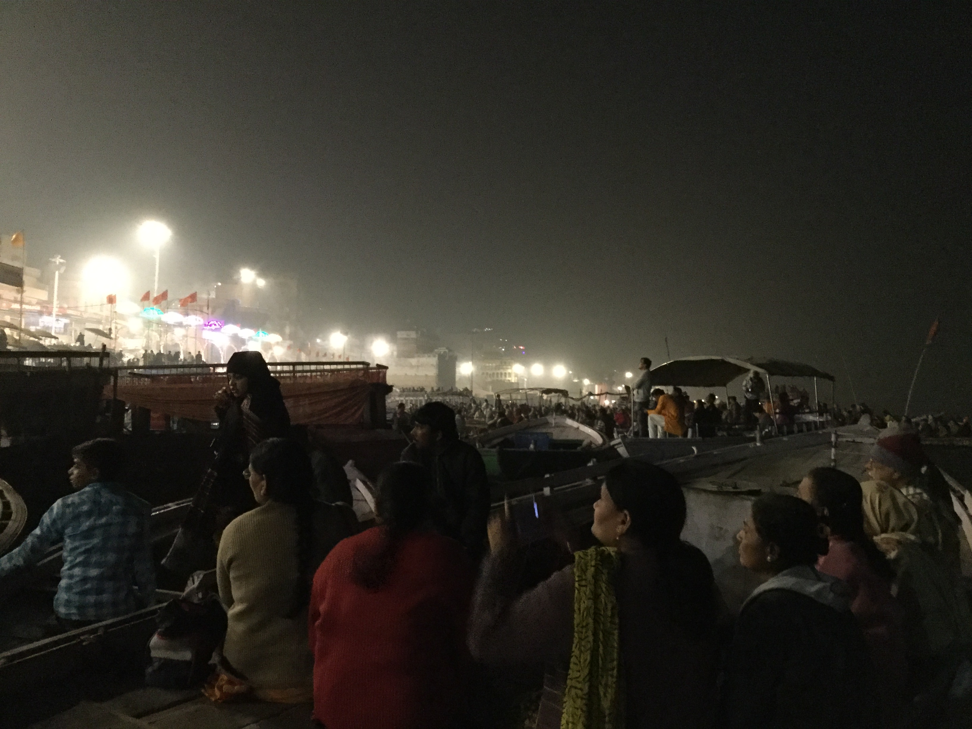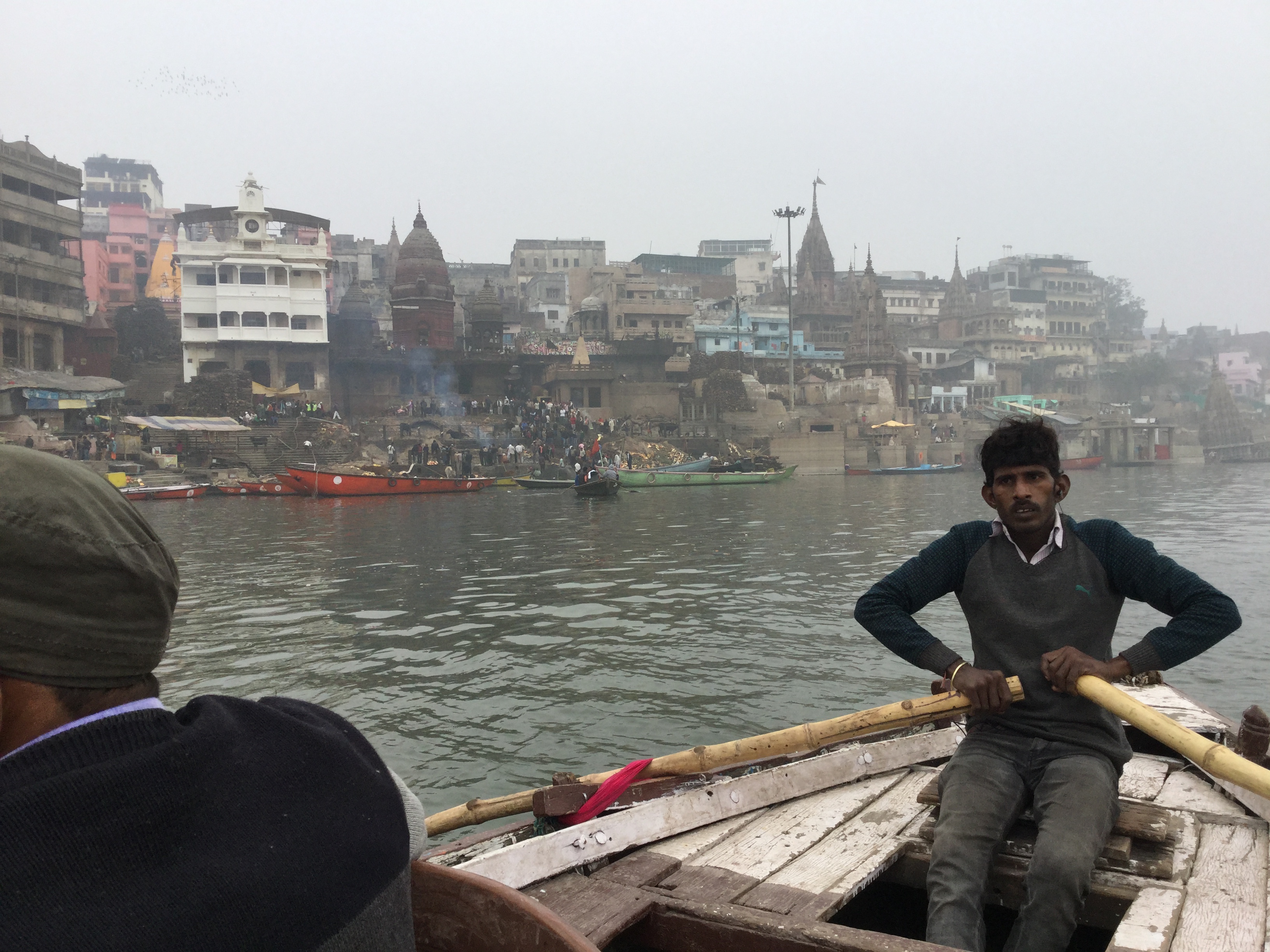 When we were planning our trip to India we all agreed that Varanasi, the spiritual capital of India located on the banks of the Ganges, was a must.  It has approximately 23,000 temples and just over a million people and has been a cultural centre of Northern India for thousands of years.   Hindus believe that death in Varanasi will bring salvation and this makes it very popular as a place of pilgrimage. There are about 84 ghats which are embankments that are made in steps of stone slabs and run along the river bank. Most of these ghats are used for bathing by pilgrims and a spiritually significant Hindu ceremony called puja – a few are used exclusively as Hindu cremation sites.  Silk weaving is the biggest industry in Varanasi and this is followed by tourism.  Our flight from Delhi, although delayed for an hour, was great and it is worth noting that Delhi airport has been named the #1 airport in the world three years in a row – it was a neat haven from super busy Delhi.  Flying out of Delhi and into Varanasi was awful as we came out of, and later into, the smog – reminded me of flying into Newfoundland except there it was fog.  It is quite the problem here and just horrible breathing in the air.  Our trip from the airport to our hotel took over two hours because of traffic which seemed to be worse than Delhi.   Lots of construction as Prime Minister Modhi has promised new roads to the airport and it has begun and looks like it will take forever.  Once again the people are patient as they manoeuvre their way along narrow streets built for two way traffic with two cars and in actuality it’s two way with several cars, trucks, tuktuks…….you get the nightmarish picture!  But our driver was amazing and got us to our hotel, actually more of a guest house called The Yoga House, without any major incident.  It is right on the banks of the Ganges, the third floor of an  open air building with rooms to the side.   Very basic, super thin towel each, no toiletries, small kitchen from which they make breakfast or a quick snack but once again very clean and a few wonderful and polite staff.  Got there late and were very tired so we crashed early and then it began – the music, but I will rant about that later as there are too many important things to tell you.